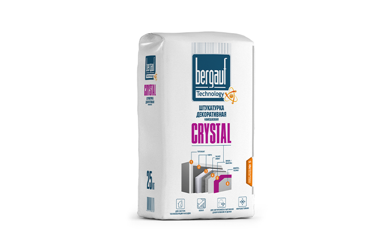 Штукатурка декоративная «Bergauf Crystal» в упаковке 25 кг — это смесь для финишной отделки фасадов. В составе — мраморная мука, цемент, а также специальные добавки, повышающие пластичность готовой смеси и прочность после высыхания.
